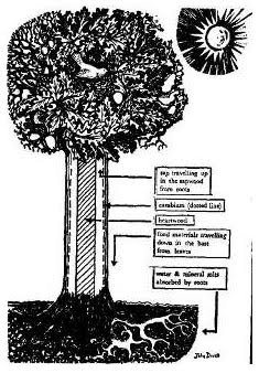 A tree can be said to have three component parts: the root, the trunk, and the crown. The roots absorb water and chemical substances from the soil which are carried by the sapwood to the leaves and branches of the tree. The bark of the tree is for protection and insulation. The growth and thickness of the trunk is brought about by cambiumnial cells situated just under the bark of the tree